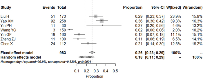 Figure 3: Meta-analysis of the prevalence rates for minor depression in RA patients in China.