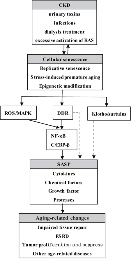 Figure 1: Cellular aging and SASP in CKD. Many factors including urinary toxins, infections, dialysis treatment, excessive activation of RAS, can cause and increase telomere shorten, the levels of oxidative stress, and abnormal epigenetic modification, resulting in cell cycle arrest and senescence related morphological changes. Sustained DNA damage response and/or the increased level of ROS directly or indirectly activate transcription factor NF-κB and C/EBP-β and further cause the secretion of SASP. SASP not only can recruit immune cells to clear antigens and the damage cells, but also can launch tissue repair by activating cellular proliferation and differentiation of progenitor cells, stem cells, or the legacy of kidney inherent cell. Once the tissue repair fails, gathered SASP will aggravate DNA damage response and cause the senescent cells to secrete more SASP, accelerating the process of cellular aging and eventually leading to ESRD and other aging-related changes. RAS: Renin-angiotensin system; ROS: Reactive oxygen species; MAPK: Mitogen-activated protein kinase; DDR: DNA damage response; NF-κB: Nuclear transcription factor; C/EBP-β: CCAAT enhancer binding protein β; SASP: Senescence-associated secretory phenotype; ESRD, End-stage renal disease.