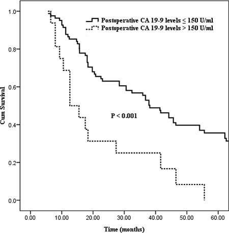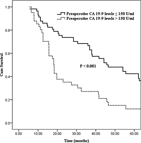 Figure 1: Kaplan–Meier curves comparing survival status stratified by preoperative CA19-9 levels (≤ 150 U/ml vs. > 150 U/ml; P < 0.001).