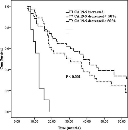 In addition, our study also assessed preoperative to postoperative CA19-9 alterations on survival. CA19-9 alterations could indirectly predict the disease evolution and increased postoperative CA19-9 is a reflection of tumor recurrence. Our results demonstrated that patients with increased postoperative CA19-9 tend to have poor survival outcome. Thus, attentions should also be paid on the preoperative to postoperative CA19-9 alterations so as to better predict the survival and tumor recurrence after surgery.