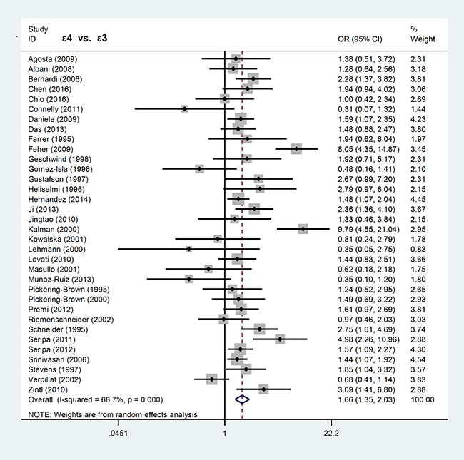 Stata/SE 12.0 software (StataCorp, USA) was used for Mantel-Haenszel statistic, Q statistic and I2 tests from P values, pooled ORs, and 95% CIs. P<0.05 was considered statistically significant. Six genetic models, namely allele (ε4 vs. ε3; ε2 vs. ε3; ε4 vs. ε2; ε4 vs. ε2+ε3+ε4, ε2 vs. ε2+ε3+ε4), homozygote (ε4ε4 vs. ε3ε3, ε2ε2 vs. ε3ε3), heterozygote (ε3ε4 vs. ε3ε3, ε3ε2 vs. ε3ε3), dominant (ε3ε4+ε4ε4 vs. ε3ε3, ε3ε2+ε2ε2 vs. ε3ε3), recessive (ε4ε4 vs. ε3ε3+ε3ε4, ε2ε2 vs. ε3ε3+ε3ε2) or carrier (ε4 vs. ε2+ε3+ε4 carrier; ε2 vs. ε2+ε3+ε4 carrier) were used and Hardy-Weinberg Equilibrium (HWE) was calculated by chi-squared test. P values of Q statistic >0.1 or I2 values ≤ 25% indicated heterogeneity between studies and the fixed-effect model was used for analysis. If not, the random-effect model was used. Subgroup analyses were performed based on ethnicity, country, source of control, clinical subtypes, HWE, and NOS score. Furthermore, Begg’s funnel plot (Begg’s test) and Egger’s publication bias plot (Egger’s test) was used to evaluate the potential publication bias. The P value of Begg’s test and Egger’s test > 0.05 was regarded as the absence of publication bias. Sensitivity analysis was also performed to evaluate the stability of statistical results.
