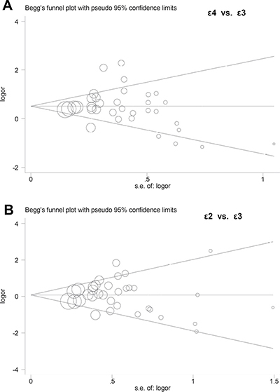 Figure 4: Begg’s funnel plots of publication bias. (A) ε4 vs. ε3 allele model; (B) ε2 vs. ε3 allele model.