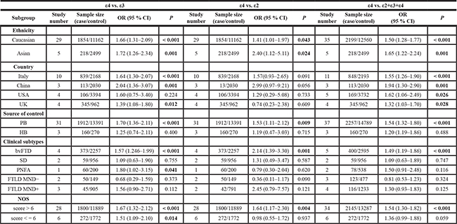 Table 2: Subgroup analysis of association between APOE ε4 and FTLD risks for ε4 vs. ε3, ε4 vs. ε2, and ε4 vs. ε2+ε3+ε4 allele models