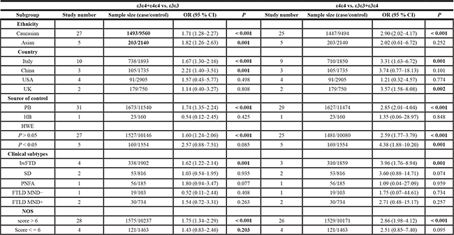 Table 3: Subgroup analysis of association between APOE ε3/ε4 genotype frequency and FTLD risks for ε4ε4 vs. ε3ε3 and ε3ε4 vs. ε3ε3 models