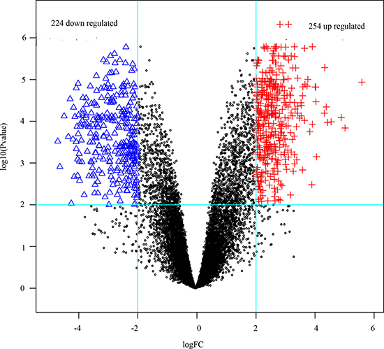 Figure 1: The DEGs in ductal tumor samples compared with those in normal samples. Blue triangles and red plus signs represented down- and up-regulated genes respectively, black dots were non-differentially expressed genes.