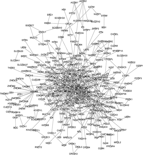 Retrieval of Interacting Genes/Proteins (STRING) [32] database (http://string-db.org/) was decided to be the Search Tool to provides a chance to reach all interaction data, including data which might be unsafe and/or predictions made by computers. There are more than 1100 organisms in extensive protein connection with global data. In this research, protein-protein interaction (PPI) network of DEGs were founded by STRING online database with threshold of score lager than 0.4. The hub protein was selected by the node degree, and the network were visualized by Cytoscape [33].