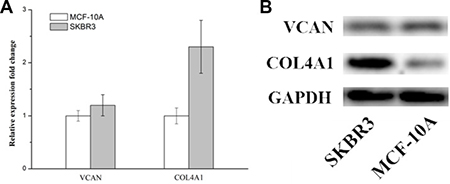 In order to assess the expression of candidate genes in the SKBR3 cells, RT-PCR and Western Blot was employed and the results were shown in Figure 7A and 7B, compared to the control (the normal lung epithelial cells BEAS-2B), a up-regulation in the mRNA levels of the gene COL4A1 was observed which is consistent with the previous findings from bioinformatics analysis. but for the VCAN gene. no significant change in the mRNA level were observed compared with the control. these results showed that COL4A1 gene were up-regulated in the SKBR3 cells.