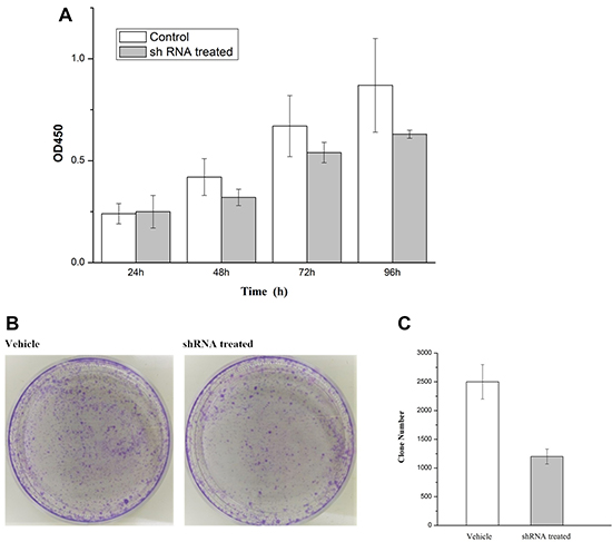 Figure 9: (A) Knockdown of COL4A1 greatly inhibited proliferate ability of SKBR3 in 96 h. (B–C) Photomicrographs of Giemsa-statined colonies of SKBR3 cells growing in 6-well plates for 5 days after infection the number of cells in each colony was counted. Cell number in shRNA treated was significantly reduced as compared with vehicle group (p < 0.001).
