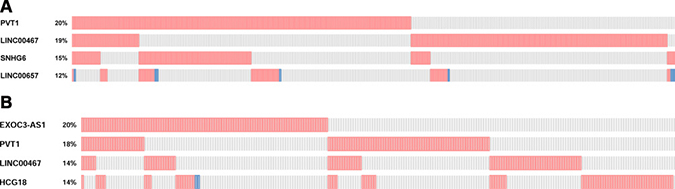 Figure 1: (A) Top 4 lncRNAs differentially expressed in breast cancer based on TCGA. (B) Top 4 lncRNAs differentially expressed in lung cancer based on TCGA.