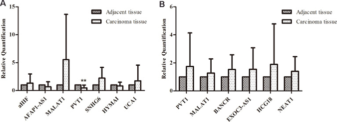 Figure 2: Comparison of lncRNAs aberrant expression in multiple primary neoplasms and their counterpart adjacent tissue. (A) The expression of selected lncRNAs in breast cancer tissues using qRT-PCR; (B) Comparison of selected lncRNAs aberrant expression in lung cancer tissues with matched adjacent tissues to cancer.)