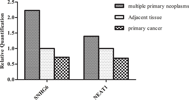 Figure 3: Comparison of lncRNAs (SNHG6,NEAT1) aberrant expression in multiple primary neoplasms with primary cancer. Compared with adjacent tissues, SNHG6 was up-regulated in most breast cancer tissues while down-regulated in primary breast cancer tissues. NEAT1 was down-regulated in primary lung cancer tissues but had higher levels of expression in lung cancer. The data indicated that SNHG6 and NEAT1 could be potential molecular indicators in breast cancer combined with primary lung cancer.)