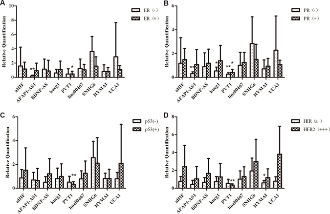The overexpression of ER and PR was proved to be important in breast cancer oncogenesis. A vast variety of researches showed that estrogen receptor (ER), progesterone receptor (PR), human epidermal growth factor receptor 2 (HER2), and EGFR presence uncovered by immunohistochemistry (IHC) is associated with cancer cell differentiation or development. They are useful indicators in endocrine therapy in breast cancer [20]. In this study, the correlation between lncRNA and clinical pathologic features, including ER/PR, HER2, and p53 protein expression were analyzed. The expressions of the lncRNAs aHIF, BDNF-AS, linc00467, SNHG6, HYMAI, UCA1 were unrelated to the expression of ER or PR. Only AFAP1-AS was significantly downregulated in ER-, PR- patients (P = 0). PVT1 was significantly downregulated in ER+ and PR- patients (P = 0.011, P = 0).