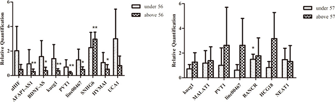 HER2 is a major target gene in breast cancer therapy [21], and p53 is an active tumor suppressor [22]. While most of the lncRNAs expression were not significantly altered among HER2 negative and HER2 positive breast cancer tissues in our study, PVT1 showed significantly lower expression in HER2 positive and p53 positive patients (P = 0.001, P = 0.006)(Figure 4). In most cases, HER2 positive (HER2+++) and P53 positive (p53+) breast cancers were accompanied by a poor clinical prognosis. Studies have suggested that overexpression of PVT1 induced the breast cancer invasiveness, lymph node metastasis [7]. It is speculated that PVT1 downregulation could result in decreased breast cancer cells migration, metastasis and proliferation in breast cancer combined with primary lung cancer. Breast cancer patients with longer survival time may have time to develop another primary cancer. The patients in this study were divided into two groups above and under their median age [23]. LncRNAs BDNF-AS, AFAP1-AS1, kucg1, PVT1, HYMAI downregulated in above 56 years, and SNHG6 was upregulated in breast cancer, while they were not significantly different in younger group (≤ 56). Meanwhile, the expression of lncRNAs kucg1, MALAT1, PVT1, linc00467, HCG18, NEAT1 did not show statistically significant difference in lung cancer tissues, except for BANCR (P = 0.033) which was upregulated in patients under 57 (Figure 5).
