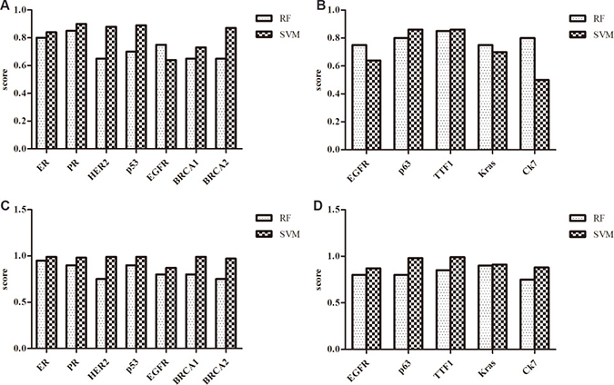 Figure 6: The scores of the interaction probability between lncRNAs and breast cancer or lung cancer associated protein predicted by RPISeq. (A) The scores of the interaction probability between PVT1 and breast cancer associated proteins. (B) The scores of the interaction probability between PVT1 and lung cancer associated proteins. (C) The scores of the interaction probability between MALAT1 and breast cancer associated proteins. (D) The scores of the interaction probability between MALAT1 and lung cancer associated proteins.