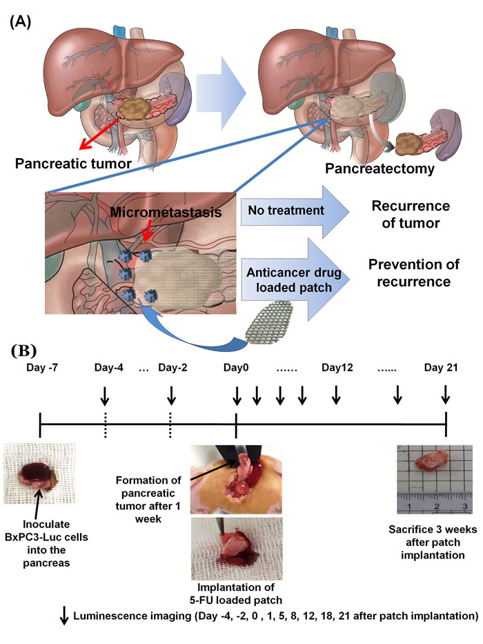 Since the amount of residual cancer cells is not large after pancreatic tumor resection, they can potentially be effectively eradicated with a small drug dose if it is properly delivered [6]. To improve adjuvant therapy of pancreatic cancer, we have designed a chemotherapeutic drug-loaded polymeric patch which can continuously administer small doses.