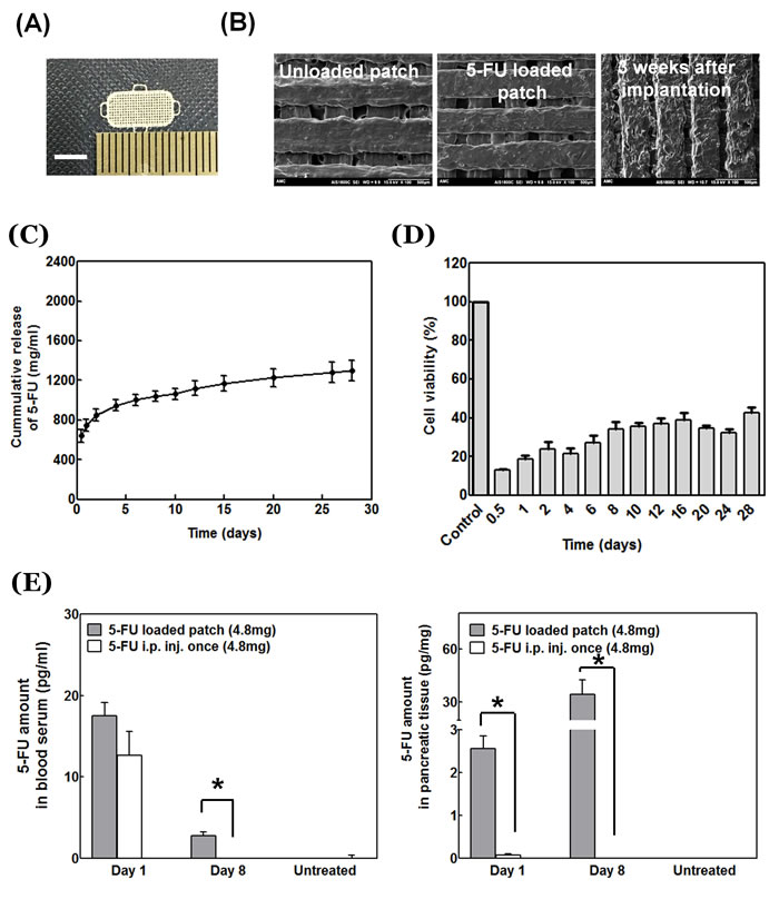Figure 2: Physical properties of 5-FU-loaded patch. A. Optical microscopy of the 5-FU-loaded patch. Scale bar: 5 mm. B. Scanning electron microscopy (Left: Unloaded patch; Middle: 5-FU-loaded patch; Right: 5-FU-loaded patch after implantation in vivo for three weeks. C. Cumulative release profile of 5-FU loaded patch. D. Cytotoxicity of 5-FU-loaded patch in vitro. E. Patch-delivered 5-FU concentration in mouse pancreas tissue and blood serum.