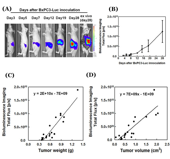 The BxPC3-Luc human pancreatic adenocarcinoma cell line, transduced with luciferase, was cultured in RPMI-1640 (RPMI; GIBCO) containing 10 % heat-inactivation fetal bovine serum (FBS; GIBCO, MD, USA) and 1 % Antibiotic-Antimycotic (AA; GIBCO, MD, USA) in a humidified incubator at 37OC with 5% CO2 atmosphere. BxPC3-Luc cells were selected in multiple steps and a clone was selected for high luciferase intensity.