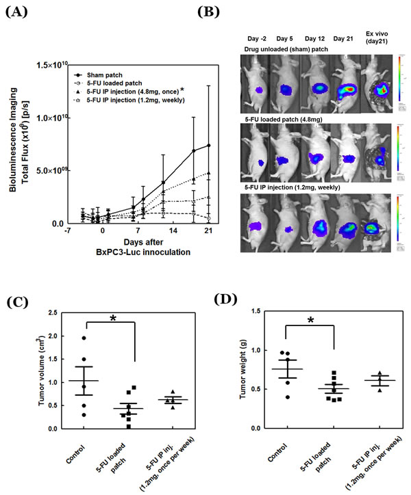 5-FU-loaded (30%) patches in the pancreas of BALC/c nude mice were attached to the pancreatic tumors 7-days after inoculation of BxPC3-Luc cells. 5-FU (1.2 mg), dissolved in PBS, was injected on the same day, and 1.2 mg of the drug was once again injected a week after the first injection for comparison with the patch. The pancreas and serum were collected on the first day of patch implantation or drug treatment and on day 8 of the study as well.