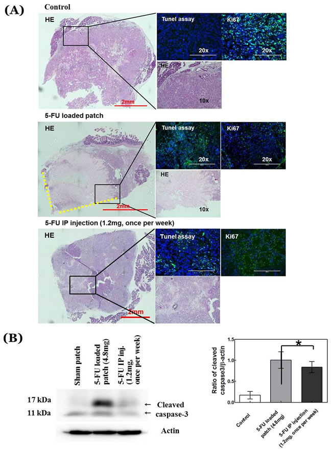 Most of the cells were stained with KI-67 and a few of them stained with TUNEL assay in the tumors covered with the sham patch (Figure 5A). In contrast, most cells around the adhesive face of the patch were stained with TUNEL in mice treated with the 5-FU-loaded patch and they did not stain with KI-67. However, some parts of the pancreatic cancer showed growth on the part of the tumor where the patch could not reach. Western blotting showed strong expression of cleaved caspase-3 indicating more apoptosis in the patch group than the control group (p = 0.018) (Figure 5). The bolus-injection group also showed a similar pattern as the mice with the drug-loaded patch. However, in the bolus-treated mice, cells inside the tumor were stained with KI-67 (Figure 5B).