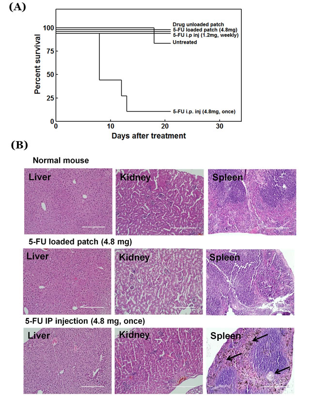 The experiment period was 28 days after cancer cell inoculation, which is not sufficient for metastasis to occur or to cause mouse death as a result of tumor growth. All mice treated with the sham patch, 5-FU-loaded patch and 5-FU bolus injection with low dose survived until the end of the experimental period. However, for the mice treated with high-dose bolus 5-FU all died, except one, during the experimental period due to drug overdose (Figure 6A).