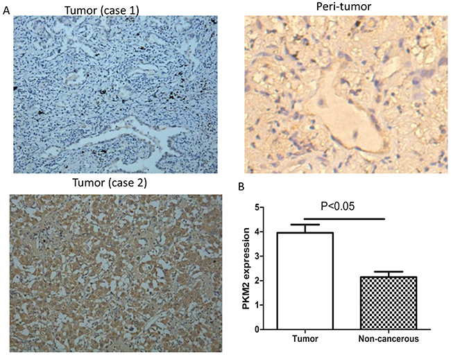 Figure 1: Immunohistochemical staining of PKM2 in lung adenocarcinoma specimens. (A) Case 1: Tumor tissue with high PKM2 expression. Case 2: Tumor tissue with low PKM2 expression. Peritumoral tissues have low PKM2 expression (×200 magnification). (B) The mean PKM2 immunohistochemical staining score in lung adenocarcinoma tissue (3.96 ± 2.91) was significantly higher than that of matched peritumoral tissue (p < 0.05) (2.14 ± 1.94).