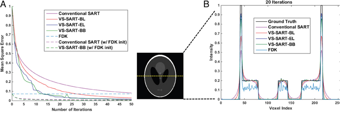 Figure 2(A) shows the mean-square error (MSE) of the four SART algorithms with increase in number of iterations. All SART algorithms showed a decrease in MSE as they iterate more loops. As seen in Figure 1, VS-SART-BL showed a faster decrease in MSE than the conventional SART. Likewise, VS-SART-EL and VS-SART-BB showed even faster decrease in MSE than VS-SART-BL. VS-SART-EL and VS-SART-BB presented spiky MSE curve since they choose step sizes that are highly adaptive at each iteration. VS-SART-BB did not monotonically decrease the MSE, however, provided the best performance especially with lower number of iterations. Figure 2(B) shows line profiles of the Shepp-Logan phantom with 20 iterations. In line with the above-mentioned characteristics, VS-SART-BL performed better than the conventional SART, as well as VS-SART-EL and VS-SART-BB performed better than VS-SART-BL. At 20 iterations, VS-SART-EL and VS-SART-BB were able to follow along the features of the ground truth image with very minimal error. Only VS-SART-EL and VS-SART-BB had lower MSE than FDK, however, features presented in line profiles showed that the contrast ratio of FDK was very poor.