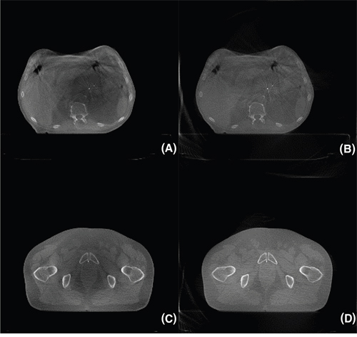 Figure 4: Reconstruction images of pancreatic (A), (B) and prostate (C), (D) cancer patient treated under radiation therapy. (A), (C) FDK, (B), (D) VS-SART-BB. A total of 655 x-ray projections were acquired in half-fan mode.