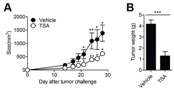 Figure 1: TSA decreased the growth of tumor in vivo. (A) BALB/c mice received s.c. injection of 2×105 Her2/CT26 tumor cells expressing human Her-2/neu. Mice were treated with TSA or vehicle until tumor size reached 50-100 mm3 (size of the tumor was measured 3 times per week). Tumor growth was measured (*p<0.05, **p<0.01, Student’s t-test; n=5 per group). (B) Four weeks after TSA administration, mice were sacrificed. Tumor tissue was isolated, and the weight of each tumor was measured (***p<0.001, Student’s t-test; n=5 per group).