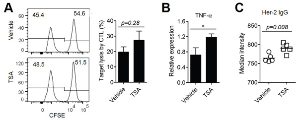 Figure 2: TSA treatment could enhance anti-tumor immunity. (A) Specific lysis of hp63 (TYLPTNASL) peptide-loaded target cells was estimated by in vivo CTL (Student’s t-test; n=5 per group). (B) mRNA was isolated from the tumors and the mRNA levels of TNF-α were analyzed by RT-PCR (*p<0.05., Student’s t-test; n=5 per group). (C) Her2-specific Abs were assessed from the sera of Her2/CT26 tumor-bearing mice treated with TSA or vehicle. Her2/CT26 cells were stained with each sera, followed by staining with FITC-conjugated secondary anti-IgG Abs (Student’s t-test; n=5 per group).