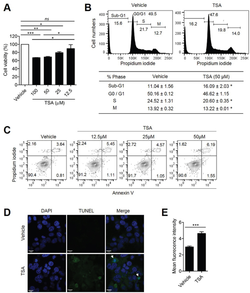 Figure 5: TSA directly induced tumor cell death. Her2/CT26 cells were treated with the indicated concentration of TSA. (A) Cell viability was evaluated at 24 h after treatment and was determined based on the absorbance at 480 nm (*p<0.05, **p<0.01, and ***p<0.0001, ns; not significant, ANOVA). (B) Propidium iodide-labeled nuclei were analyzed for determination of cell cycle stage. The sub-G1 phase cells containing apoptotic populations were analyzed by flow cytometry (*p<0.01, two-tailed unpaired t-test). (C) Cells were incubated with 0, 12.5, 25, and 50 μM TSA for 24 h. Annexin-V- and propidium iodide-stained cells were analyzed for cell death using flow cytometry. (D) Her2/CT26 cells were treated with 100 μM TSA for 24 h and then stained using the TUNEL assay. Apoptotic cells were examined by confocal microscopy. (E) The mean green fluorescence intensity of TUNEL positive cells is summarized (***p<0.001, two-tailed unpaired t-test).