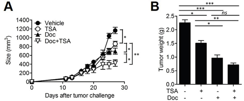 Figure 6: Combined therapy with TSA and docetaxel enhanced anti-cancer activity. (A) BALB/c mice received s.c. injections of 2×105 Her2/CT26 tumor cells. Mice were treated with each or both of TSA and docetaxcel as the tumor size reached 50~100 mm3. The growth of the tumor was monitored (*p<0.05, **p<0.01, ANOVA; n=5 per group, ANOVA). (B) The weight of the tumor was measured at 4 weeks after tumor challenge (*p<0.05, **p<0.01, and ***p<0.001; ANOVA; n=5 per group).
