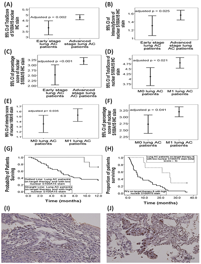 Figure 1: Immunohistochemistry (IHC) nuclear staining for S100A15 in patients with lung adeonocarcinoma (AC). In the 115 lung AC cases, (A) total score, (B) intensity score, and (C) percentage score of S100A15 nuclear stain were all significantly increased in patients with advanced tumor stage (stage IIIB and IV, n = 91) compared to that in those with early tumor stage (stage I - IIIA, n = 24). (D) Total score, (E) intensity score, and (F) percentage score of S100A15 nuclear stain were significantly increased in lung AC patients with distant metastasis (M1, n=77) as compared with that in those without distant metastasis (M0, n=38). Kaplan-Meier survival analysis showed significantly reduced (G) one-year overall survival (p=0.024 by log-rank test) and (H) three-year overall survival (p = 0.049 by the log-rank test) in the 33 AC patients receiving first line target therapy and harboring high nuclear expressions of S100A15 (total score < 3), compared with that in the 7 AC patients receiving first line target therapy and harboring low nuclear expressions of S100A15 (total score < 3). Immunohistochemistry analysis of S100A15 in paraffin embedded sections of (I) histologically proven AC, stage 1B, with nuclear percentage score 2 and nuclear intensity score 2, and (J) AC, stage 4, with nuclear nuclear percentage score 3 and intensity score 3.