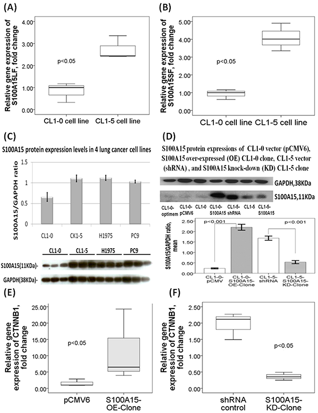 Figure 3: S100A15 gene and protein expressions in lung adenocarcinoma (AC) cell lines with high metastasis versus low metastasis properties. Quantitative RT-PCR validation showed increased gene expressions of both (A) S100A15 long form (LF) and (B) S100A15 short form (SF) transcripts in CL1-5 cell line as compared with that in CL1-0 cell line. (C) Western blot results showed that S100A15 protein expression was significantly increased in the 3 lung cancer cell lines with high metastasis potential as compared to CL1-0 cell line (all p values < 0.05). (D) Western blot showed increased and decreased S100A15 protein expressions in S100A15 over-expressing CL1-0 cells and S100A15 knock-down CL1-5 cells, respectively. All experiments were performed independently for at least three times.