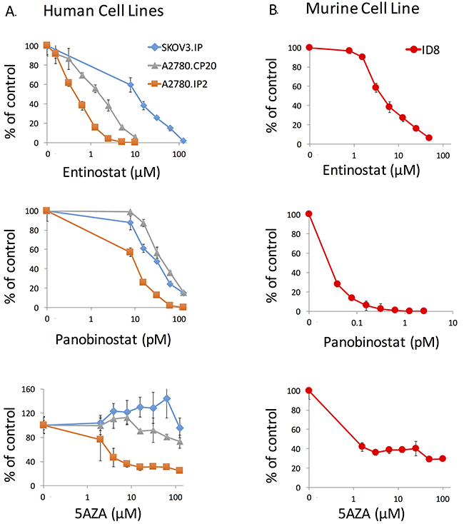 Figure 1: ATPlite assay of entinostat, panobinostat, and azacytidine against human and murine ovarian cancer cell lines. (A) A2780.IP2, A2780.CP20, and SKOV3. IP were treated for 72 hours to identify a dose range using the ATPlite assay. (B) ID8 cells were treated for 72 hours with the same agents. Error bars represent standard error of the mean (SEM) for the eight replicates.
