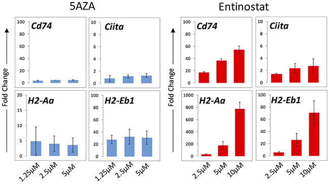 Figure 2: mRNA transcript levels of MHC II pathway genes in ID8 cells evaluated by qPCR. Cells were exposed to entinostat and azacytidine for 24 hours at three concentrations. Bars represent median ± standard deviation of fold change across three replicates. The y axis represents fold change relative to untreated cells.