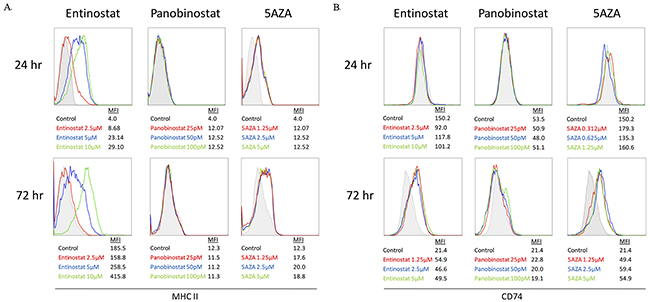 Figure 3: MHC II pathway upregulation on ID8 cells treated with entinostat, panobinostat, or azacytidine evaluated via flow cytometry. (A) Histograms of MHC II expression after 24 and 72 hours of exposure are shown with mean fluorescence intensity (MFI) for each concentration. (B) Histograms of CD74 expression after 24 and 72 hours of exposure are shown with MFI for each concentration.