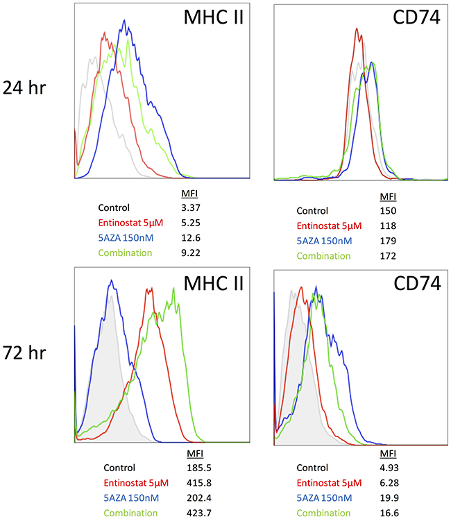 Figure 4: MHC II and CD74 protein expression on ID8 cells after combination treatment with entinostat and azacytidine. MHCII and CD74 expression were measured by flow cytometry 24 and 72 hours after treatment with 5 μM entinostat in combination with 150 nM azacytidine.