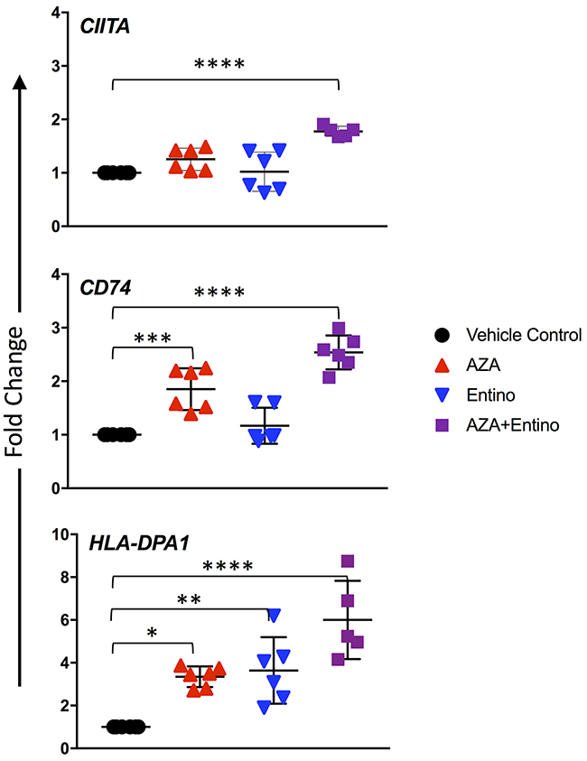 To determine if the combination of entinostat plus azacytidine led to increased MHC II gene expression in vivo, we began by evaluating an OVCA PDX model in SCID mice. CIITA was significantly increased (1.8-fold, p < 0.0001) relative to the vehicle control group in the combination treatment group, and the mean difference in fold change was significantly higher than in mice treated with azacytidine (p = 0.005) or entinostat alone (p = 0.0001) (Figure 5). In response to the combination treatment, CD74 expression was increased 2.5-fold (p < 0.0001) relative to vehicle controls, which was significant as compared to azacytidine or entinostat alone (p = 0.004) and (p = 0.0001), respectively. Treatment with only azacytidine resulted in a significant 1.9-fold increase (p = 0.0005) of CD74 relative to the vehicle control group, whereas CD74 expression was not statistically different in the entinostat group.