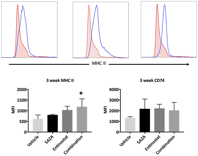 Figure 6: Expression of MHC II and CD74 proteins in ovarian tumors of MISIIR-Tag mice after 3 weeks of treatment. All mice initiated treatment at 10 weeks of life. Doses were daily azacytidine 2 mg/kg, entinostat 5 mg/kg, and both agents in combination. Histograms and bar graphs depict MHC II and CD74 expression on gated CD45-negative single cells within dissociated tumors. Dunnett’s test comparing combination treatment to vehicle control show a significant difference (p = 0.0357), marked with *.