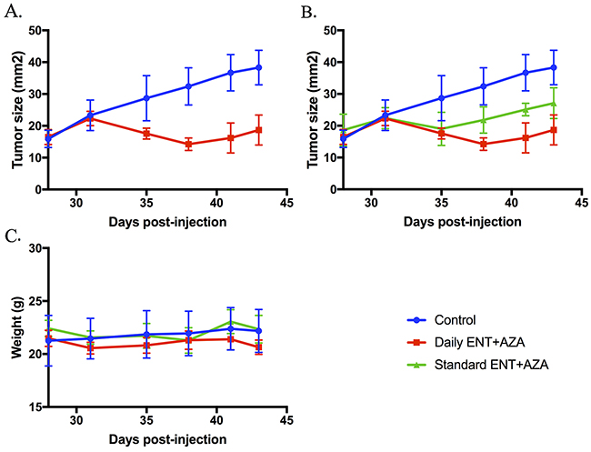 Figure 7: Tumor size and mouse weights after 15 days of treatment with combination HDACi and DNMTi therapy. ID8 C57BL/6 mice were treated with entinostat and azacytidine. Doses were entinostat 20 mg/kg daily and every other day (standard) and azacytidine 0.8mg/kg daily. Tumor size in both the daily group (A) and the standard treatment group (B) were significantly reduced compared to untreated controls (both p < 0.05). Treatments were well-tolerated with no significant weight loss occurring in any group (C).