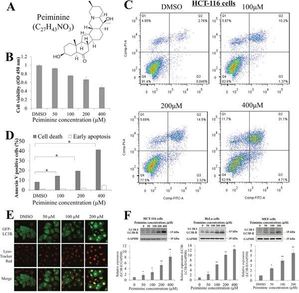 Figure 1: Peiminine inhibits growth and induces apoptosis in HCT-116 cells. (A) Molecular structure and formula of peiminine. (B) Results of viability assay showing dose-dependent decrease in HCT-116 cell viability after peiminine treatment at 0, 50, 100, 200 and 400 μM concentrations. (C) Double staining of peiminine-treated and untreated HCT-116 cells with propidium iodide and annexin V and vehicle control (DMSO) for 24 hours for flow cytometry. (D) Percentage of dead and early-apoptotic cells in three independent experiments.* p ≤ 0.05. DMSO, dimethyl sulfoxide. (E) Confocal microscopy images of the Hela cells treated with DMSO(0), 50, 100 and 200 μM peiminine for 24 h. Green coloring indicates the presence of stably expressed LC3II. Red coloring indicates the presence of lysosomes (magnification, ×630). (F) Dose-dependent increases in LC3B-II/LC3B-I ratio with peiminine treatment at 0, 50, 100, 200 and 400 μM concentrations in HCT-116, HeLa, and MEF cells. Three independent immunoblot assays were performed and gray scale images of each assay were scanned and presented as a bar chart in which the vertical axis is the mean gray scale ± SD. * indicates statistical differences at p < 0.05 and ** indicates statistical differences at p < 0.01.