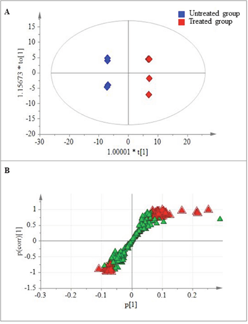 Figure 3: Metabolites found at significantly different levels in treated and untreated HCT-116 cells. (A) Plot of the scores from the PLS-DA model of the treated and untreated groups. (B) Loading plot from the PLS-DA model of the treated and untreated groups. The boxes represent the tested samples while metabolites are displayed as triangles. Metabolites playing key roles for separation are marked with red triangle.
