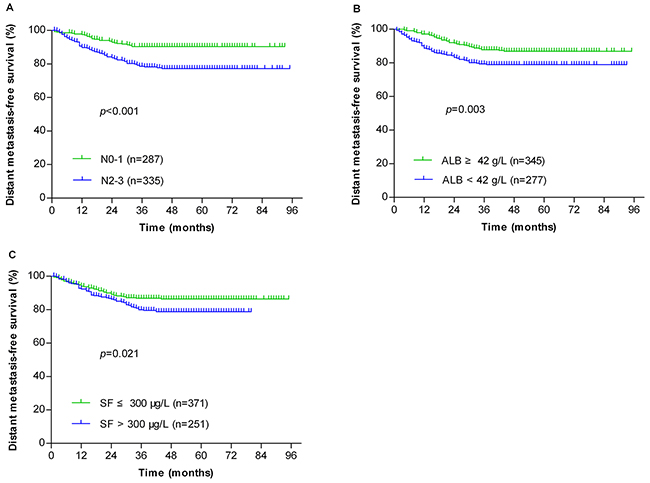Figure 1: Kaplan-Meier analysis of the distant metastasis-free survival for all NPC patients (n=622) after being stratified by N stage (A), serum albumin (B) and serum ferritin (C).