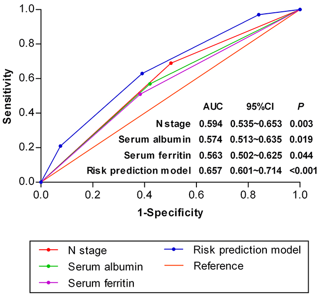 Figure 2: Receiver operating characteristic curves for distant metastasis in NPC patients (n=622) based on the individual risk factors and risk prediction model.