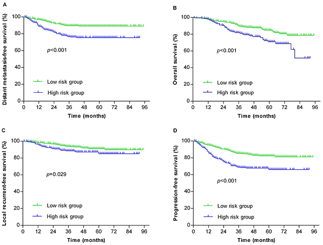 Figure 3: Stratification analysis of the survival of NPC patients. The patients were stratified into the low-risk (n=355) and high-risk (n=267) groups using the distant metastasis risk prediction model. The distant metastasis-free survival (A), overall survival (B), local recurrent-free survival (C) and progression-free survival (D) were statistically analyzed.