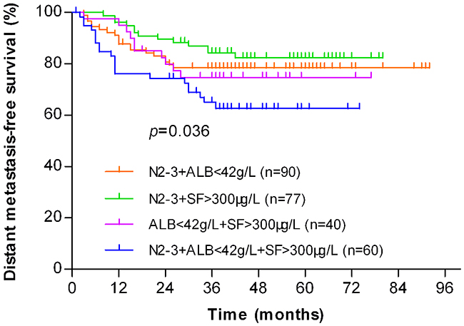 In the high-risk group, there were 90 patients at N2-3 stage and ALB < 42 g/L, 77 patients at N2-3 stage and SF > 300 μg/L, 40 patients with ALB < 42 g/L and SF > 300 μg/L, and 60 patients with the three risk factors. There was a significant difference in the DMFS rates among these four groups (P = 0.036, Figure 4). Among them, the DMFS rate of patients at N2-3 stage and SF > 300 μg/L had the best survival value, followed by patients at N2-3 stage and ALB < 42 g/L, and then the patients with ALB < 42 g/L and SF > 300 μg/L, while the patients with three risk factors had the worst survival value.