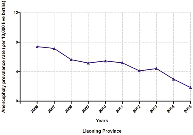 To the best of our knowledge, this population-based report is one of the limited studies from China that describes the time trend of anencephaly prevalence on the basis of the data from most recent decade. Between 2006 and 2015, the prevalence of anencephaly in Liaoning province in Northeast China significantly decreased from 7.40 to 1.84 per 10,000 live births. Moreover, decreasing trends were observed in all 14 cities, but not all of them showed statistically significant changes. Since a high prevalence was still found in some cities, further prevention efforts are warranted to reduce the risk of anencephaly in these areas.