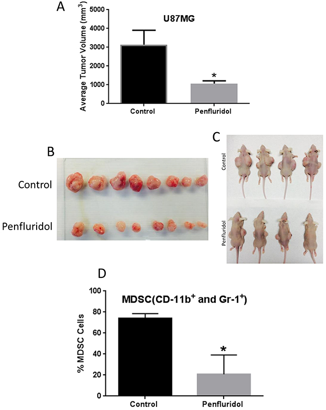 Figure 1: Penfluridol suppresses glioblastoma tumor growth and associated MDSCs. 1×106 U87MG cells in 1:1 mixture of PBS and matrigel were implanted in right and left flanks of 4-6 week old athymic nude mice. Treatment with 10mg/kg penfluridol by oral gavage everyday started once tumor size was 70-100mm3 after tumor cells injection till day 48. Tumors from all control and penfluridol treated mice were removed at day 48. (A) Bar graph representing average tumor volume of control and penfluridol treated mice at day 48. Values were plotted as mean ± SEM. (B-C) Representative images of tumors as well as mice bearing tumors from control and treated group. Peripheral blood mononuclear cells (PBMCs) were collected from the blood obtained from control and penfluridol treated U87MG tumor-bearing athymic nude mice. Modulation of CD11b+ and Gr-1+ cells was analyzed by immunostaining and fluorescence cytometry to determine the effects of penfluridol on mouse myeloid derived suppressor cells (MDSCs); statistical analysis was performed by Student’s t test. (D) Bar chart showing percent MDSCs which were double stained with CD11b and Gr-1 mouse antibodies. *Statistically significant at p<0.05 when compared with control.