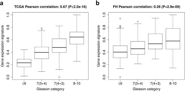 Figure 1: Gene expression signature of Gleason score in The Cancer Genome Atlas (TCGA) dataset and the Fred Hutchinson (FH) cohort. (a) Box plots of the gene expression signature for patients in different Gleason score categories in TCGA. (b) Box plots of the gene expression signature for patients in different Gleason score categories in the FH cohort.