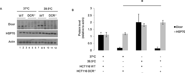 Figure 2: Elevated dicer protein levels observed during mild (39.5°C) hyperthermia-induced thermotolerance are not linked to HSP70 protein levels. (A) Western blot analysis of HSP70 protein levels in wildtype (WT) and dicer deficient (DCR-/-) HCT116 cells at mild hyperthermia (39.5°C) for 16h. (B) Protein band intensities in (A) were first normalized to the actin band intensities corresponding to the specific protein and further normalized to the first experimental replicate in control (lane 1) and mild hyperthermia (lane 7) samples within each biological replicate. The representative western blot images for Actin correspond to the western blot image for dicer in this figure. Values shown are mean ± SEM. p < 0.05.